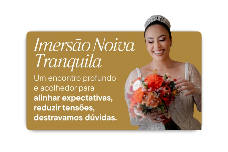 Reuni tudo o que transforma a experiência da noiva: acolhimento, direção clara, organização estratégica e acompanhamento próximo — tudo em uma única oportunidade disponível por tempo limitado.